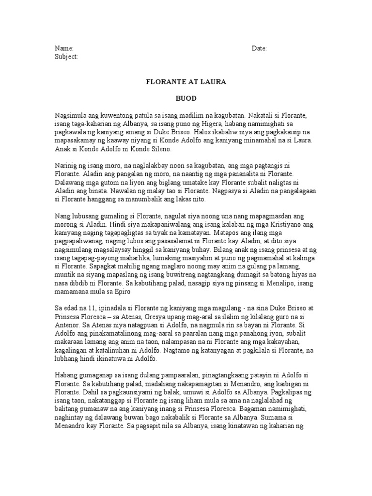 Scribd è il più grande sito di social reading e publishing al mondo. Kahalagahan ng Florante at Laura sa ating buhay. Ang butihing prinsesa ay anak ng hari ng krotona at ang mabait na duke ay siyang salamin sa karunungan sa buong albanya.