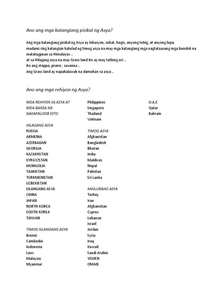 Ano Ang Mga Katangiang Pisikal Ng Asya Pdf